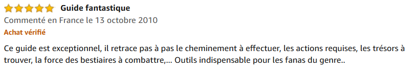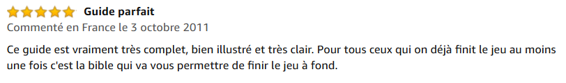« Ce guide est vraiment très complet, bien illustré et très clair. Pour tous ceux qui on déjà fini le jeu au moins une fois c’est la bible qui va vous permettre de finir le jeu à fond. »