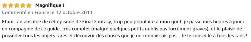 « Etant fan absolue de cet épisode de Final Fantasy, trop peu populaire à mon goût, je passe mes heures à jouer en compagnie de ce guide, très complet (malgré quelques petits oublis pas forcément graves), et le plaisir de posséder tous les objets rares et découvrir des choses que je ne connaissais pas… Je le conseille à tous les fans ! »