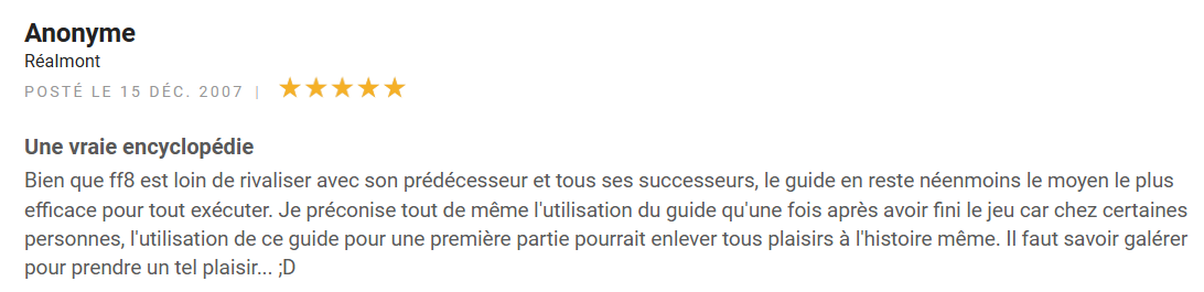 « Bien que FF8 est loin de rivaliser avec son prédécesseur et tous ses successeurs, le guide en reste néenmoins le moyen le plus efficace pour tout exécuter. Je préconise tout de même l’utilisation du guide qu’une fois après avoir fini le jeu car chez certaines personnes, l’utilisation de ce guide pour une première partie pourrait enlever tous plaisirs à l’histoire même. Il faut savoir galérer pour prendre un tel plaisir… »