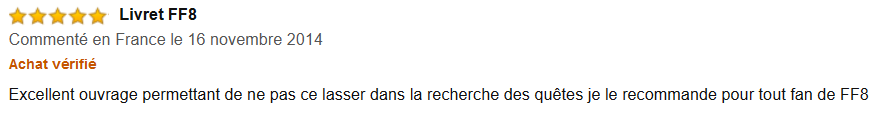 « Excellent ouvrage permettant de ne pas se lasser dans la recherche des quêtes je le recommande pour tout fan de FF8. »