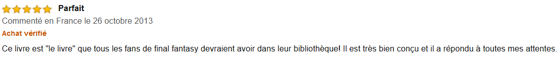 « Ce livre est ‘le livre’ que tous les fans de final fantasy devraient avoir dans leur bibliothèque! Il est très bien conçu et il a répondu à toutes mes attentes. »