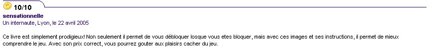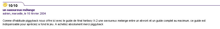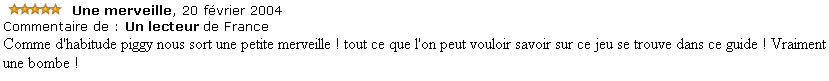 « Comme d’habitude, Piggyback nous offre ici un savoureux mélange entre un artbook et un guide complet au maximum. Ce guide est indispensable pour apprécier le jeu à fond. A acheter absolument ! Merci Piggyback. »