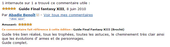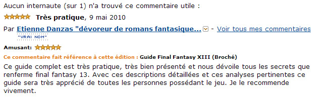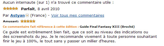 « Ce guide complet est très pratique, très bien présenté et nous dévoile tous les secrets que renferme Final Fantasy 13. Avec ses descriptions détaillées et ses analyses pertinentes, ce guide sera très apprécié de toutes les personnes possédant le jeu. Je le recommande vivement. »