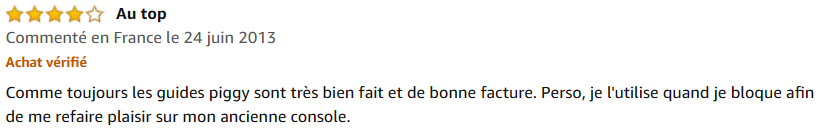 « Comme toujours les guides piggy sont très bien faits et de bonne facture. Perso, je l’utilise quand je bloque afin de me refaire plaisir sur mon ancienne console. »