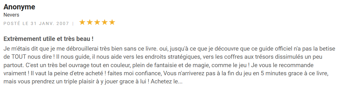 « Je m’étais dit que je me débrouillerai très bien sans ce livre. Oui, jusqu’à ce que je découvre que ce guide officiel n’a pas la bêtise de TOUT nous dire ! Il nous guide, il nous aide vers les endroits stratégiques, vers les coffres aux trésors dissimulés un peu partout. C’est un très bel ouvrage tout en couleur, plein de fantaisie et de magie, comme le jeu ! Je vous le recommande vraiment ! Il vaut la peine d’être acheté ! Faites moi confiance, Vous n’arriverez pas à la fin du jeu en 5 minutes grâce à ce livre, mais vous prendrez un triple plaisir à y jouer grâce à lui ! Achetez le… »