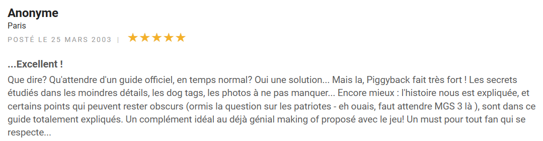 « Que dire ? Qu’attendre d’un guide officiel, en temps normal ? Oui une solution… Mais la, Piggyback fait très fort ! Les secrets étudiés dans les moindres détails, les dog tags, les photos à ne pas manquer… Encore mieux : l’histoire nous est expliquée, et certains points qui peuvent rester obscurs (hormis la question sur les patriotes – eh ouais, faut attendre MGS 3 là ), sont dans ce guide totalement expliqués. Un complément idéal au déjà génial making of proposé avec le jeu! Un must pour tout fan qui se respecte… »