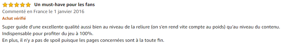 « Super guide d’une excellente qualité aussi bien au niveau de la reliure (on s’en rend vite compte au poids) qu’au niveau du contenu. Indispensable pour profiter du jeu à 100%. En plus, il n’y a pas de spoil puisque les pages concernées sont à la toute fin. »