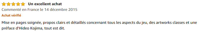 « Mise en page soignée, propos clairs et détaillés concernant tous les aspects du jeu, des artworks classes et une préface d’Hideo Kojima, tout est dit. »