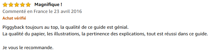 « Piggyback toujours au top, la qualité de ce guide est géniale. La qualité du papier, les illustrations, la pertinence des explications, tout est réussi dans ce guide. Je vous le recommande. »