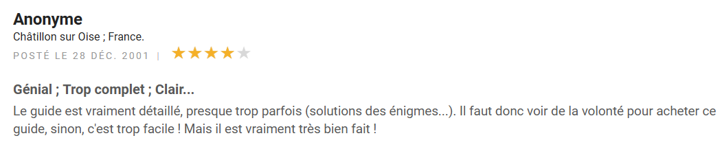 « Le guide est vraiment détaillé, presque trop parfois (solutions des énigmes…). Il faut donc avoir de la volonté pour acheter ce guide, sinon, c’est trop facile ! Mais il est vraiment très bien fait ! »