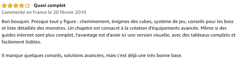 Bon bouquin. Presque tout y figure : cheminement, énigmes des cubes, système de jeu, conseils pour les boss et liste détaillée des monstres. Un chapitre est consacré à la création d’équipements avancée. Même si des guides internet sont plus complet, l’avantage est d’avoir ici une version visuelle, avec des tableaux complets et facilement lisibles. Il manque quelques conseils, solutions avancées, mais c’est déjà une très bonne base.